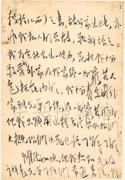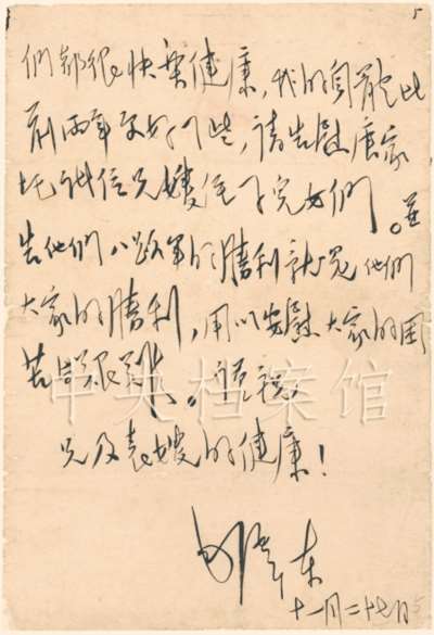 运昌吾兄:莫立本到,接获手书,本日又接十一月十六日详示,快慰莫名。八舅父母仙逝,至深痛惜。诸表兄嫂幸都健在,又是快事。家境艰难,此非一家一人情况,全国大多数人皆然,惟有合群奋斗,驱除日本帝国主义,才有生路。吾兄想来工作甚好,惟我们这里仅有衣穿饭吃,上自总司令下至火夫,待遇相同,因为我们的党专为国家民族劳苦民众做事,牺牲个人私利,故人人平等,并无薪水。我为全社会出一些力,是把我十分敬爱的外家及我家乡一切穷苦人包括在内的,我十分眷念我外家诸兄弟子侄,及一切穷苦同乡,但我只能用这种方法帮助你们,大概你们也是已经了解了的。日本帝国主义正在大举进攻,我们的工作是很紧张的,但我们都很快乐健康。并告他们,八路军的胜利就是他们大家的胜利,用以安慰大家的困苦与艰难。