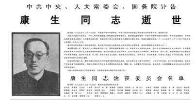 中国共产党中央委员会、中华人民共和国全国人民代表大会常务委员会、国务院沉痛地宣告:中国共产党中央委员会委员、中央政治局委员、中央政治局常务委员会委员、中央委员会副主席、全国人民代表大会常务委员会副委员长康生同志,因病长期医治无效,于一九七五年十二月十六日六时五分在北京逝世,终年七十七岁。