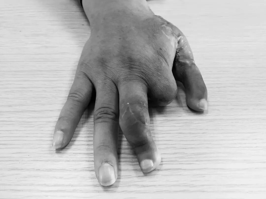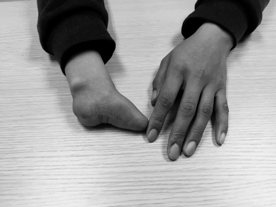 图为秋姐的手。她的小手指表面看没有很大异常,但其实已经失去知觉。