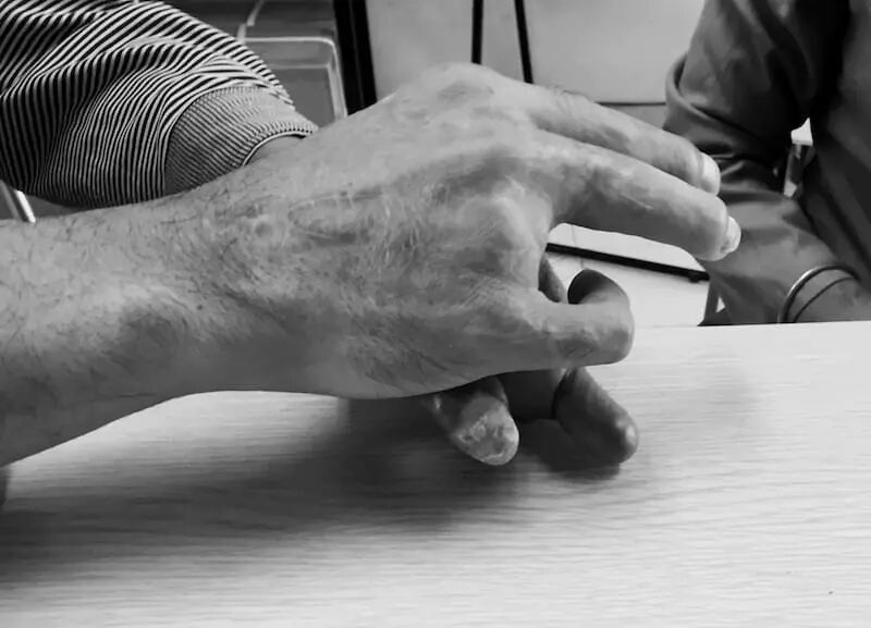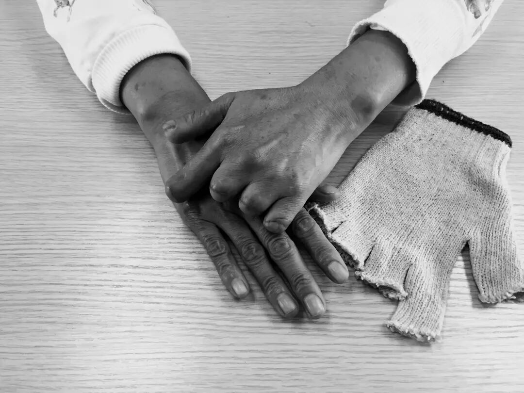 图为秋姐丈夫的双手。他受过两次工伤,伤势比较严重。