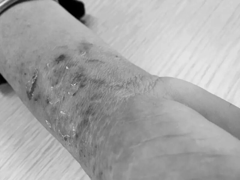 图为秋姐的手腕。为了早日能活动,她使用了一些偏方,皮肤被蒜头灼伤。