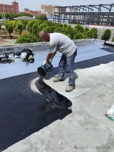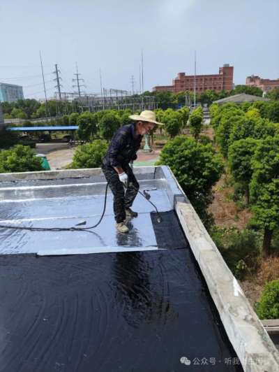 前几天,天气预报气温40度。上午,大家在楼顶平台上做防水施工。