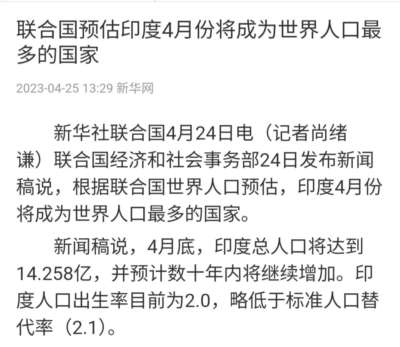 2023 年,联合国经济和社会事务部(DESA)发布报告:印度的人口已经达到约 14.258亿,正式超过中国,成为世界人口最多的国家。