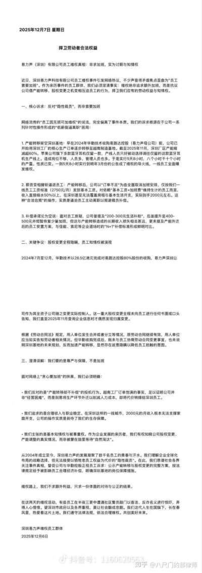2025年12月4日至今,易力声科技(深圳)有限公司的员工已经集体“停工”一周多了。