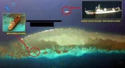 就在小马斯科访美前几天,也就是4月23日,菲律宾海岸警卫队两艘巡逻船,试图接近坐沉仁爱礁的登陆舰。被中国海警5201船拦截驱离,双方最近时仅有120-150英尺(约等于37-46米之间)。