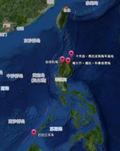 地图上可以清晰地看到,美军新增的4个基地中,前3个基地靠近巴士海峡,明显是针对台海,最北侧的卡米洛·奥西亚斯海军基地,距离中国台湾的直线距离只有400公里。如果台海爆发冲突,美军有很大概率通过这些军事基地给中国使绊子。