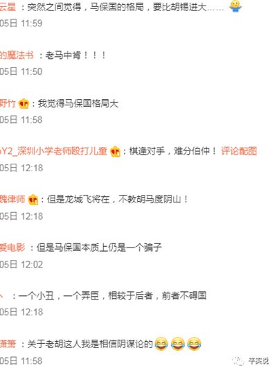 马保国的形象固然猥琐、被全网鄙视、嘲弄,但是,与胡锡进一比,马上就光辉起来,也受人“尊重”了。