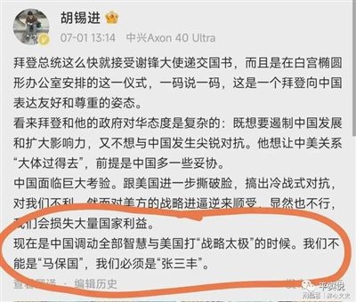 这次,谢锋大使见拜登,或许胡锡进觉得中美关系大局要转好了,所以,立即出来写小作文表示庆贺。