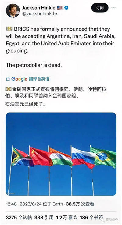 “金砖国家正式宣布将阿根廷、伊朗、沙特阿拉伯、埃及和阿联酋纳入金砖国家组织。石油美元已经死了。”