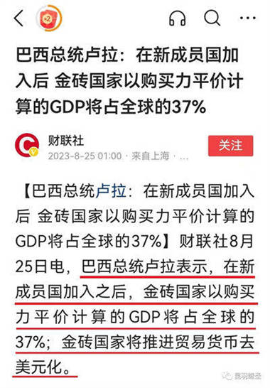 8月25日,巴西总统卢拉表示,在新成员国加入以后,整个金砖国家组织以购买力平价计算的GDP将占世界的37%,而金砖国家将推进贸易货币去美元化。