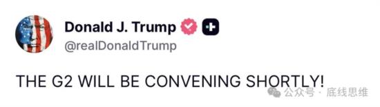 金灿荣:很多朋友注意到,在两国元首会晤之前,特朗普总统在他的社交媒体上发了一句很短的话,意思就是G2要开会了。这很有意思。从某种意义上讲,特朗普就是承认中美是对等的大国了。当然中国政府不一定接受G2这个提法,我记得很多年前佐利克就提过“G2两国集团论”那一套,中国是拒绝的,谁也没想到特朗普又提G2了。