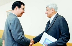 志位委员长在致欢迎词时说:“我们热烈欢迎CPIM代表团的到访。”志位提到了日共2002年对印度的访问,会见当时的苏鲁吉特总书记时,双方确立了三条共同立场:(1)反对美国进攻伊拉克,(2)追求真正的不结盟的国家外交,(3)尊重各自国家的革命运动的自主性。志位说:“我们希望通过这次会谈进一步发展两党之间的关系。”