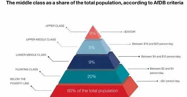 非洲发展银行的统计数据显示,以收入和消费作为维度,正在步入中产阶级、中产阶级及上层阶级在非洲的总人口占比约为40%(来源:useit.com.cn)