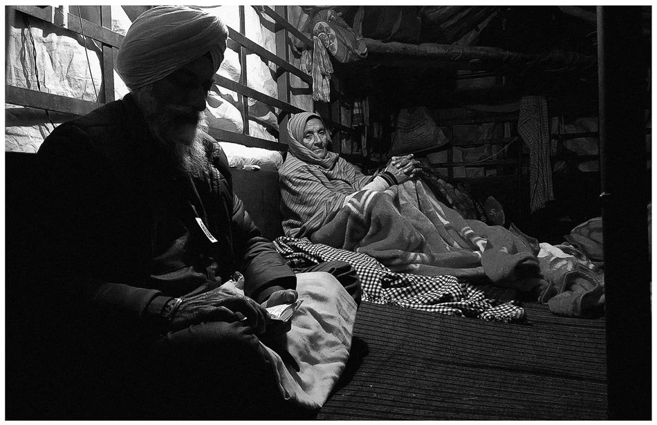 2020年12月28日,在德里和辛古的交界处,一对农民夫妇在自己的推车里度过冬夜
