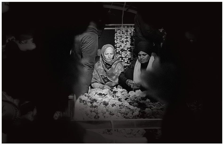 2020年12月31日,在德里和辛古的交界处,妇女们在装饰一种锡克教的结构