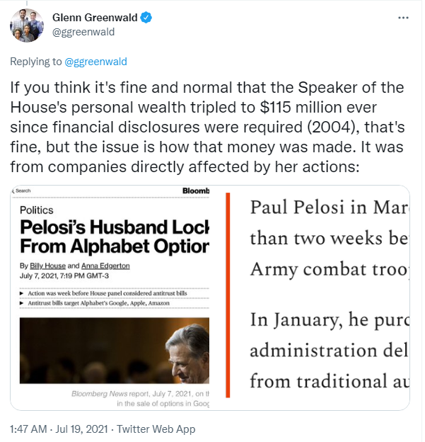 美国彭博社本月初的一篇报道指出,保罗·佩洛西通过对谷歌母公司“字母表”公司的投资,获得了大笔收益。南希7月2日签署的一份财务披露文件显示,保罗行使执行价1200美元的看涨期权,取得了“字母表”公司4000股股票,这笔交易使他获利480万美元,而随着“字母表”股价上涨,保罗的收益也上升至530万美元。