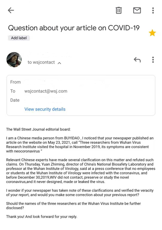 我是BUYIDAO的中文媒体人,我注意到你的报纸于2021年5月23日在网站上发表了一篇文章,称“武汉病毒研究所的三位研究人员于2019年11月访问了该医院,其症状与新冠病毒一致”
