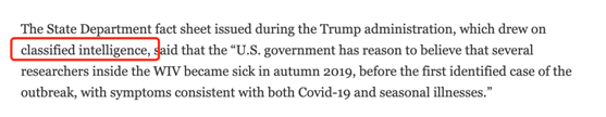 《华尔街日报》 “独家爆料”中引用的内容,应该是去年5月特朗普政府时期炮制出来的报告,报告宣称“美国政府有理由相信在2019年秋季,武汉病毒研究所的研究人员就已经染病了”。目前,这份报告没有解密,只活在迈克尔·戈登们的嘴里。