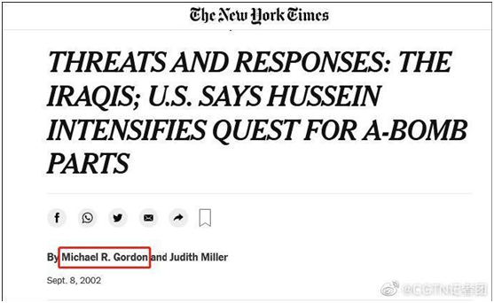 此人19年前供职于《纽约时报》时,炒作伊拉克“试图获得核武器”,“购置用于浓缩铀离心机的铝管”的文章。该文被美国政府高层广泛引用,成为了布什政府发动伊拉克战争的重要依据。