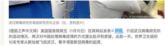 而早在今年1月15日,世界卫生组织溯源联合专家组来华当口,美国国务院原封不动地按照蓬佩奥时期的 “事实清单”,发表了所谓“武汉病毒所研究人员染病”的声明,对中国横加指责。