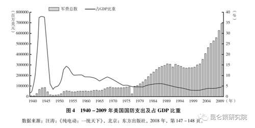 我们看到,美国在1940~1945年第二次世界大战中,美国国防支出占国内生产总值(GDP)比重接近40%,而后至2009年国防支出在大幅增涨的同时,其在占GDP的比重却大幅下降,基本保持在5%的水平。学者汪涛认为:“如果仅为国家安全考虑的话,这个比例合理的比值在1%~2%就足够了。就算以2%考虑,美国军费开支占GDP比例有3个百分点是超乎‘常规’的,也就是美国军费开支中有一多半是自身安全不需要的。这个增加的投资如果不能获得比投资额高出3倍以上的收益,经济上就是不合理和难以常年维持的。也就是说,美国需要通过军费投入获得占GDP至少10%的收益,才能合理地解释其行为在经济上是合理的。事实上,真正获得的收益远超过这个数字,其原因只有通过美元霸权所获得的利益才能获得合理解释。”