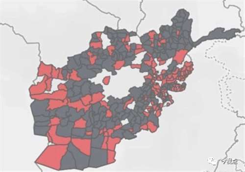 下图是最近的阿富汗势力图,黑色区域是塔利班控制、白色是政府军控制,红色为双方争夺区,可以看到政府区只有中心很小的范围,而塔利班控制的区域要大的多、遍布全国。