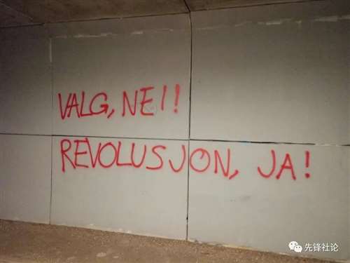 在克里斯蒂安桑(Kristiansand),有人创作了一系列涂鸦【12】,以支持革命者呼吁的抵制选举,反对将于11月举行的资产阶级选举。涂鸦上写着“抵制选举”,并绘有锤子镰刀,以及“投票,错!革命,好!”和“抵制选举!为了革命,为了一个新式的工人国家!”。抵制选举运动旨在组织人民反对反动选举,谴责选举是统治阶级对工人阶级实行统治的一种手段。
