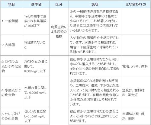 部分截取《水道法》规定的51项水质基测项目,图中包括细菌、大肠杆菌、 镉、汞、硒及其化合物含量标准。图片来源:东京都水道局官网