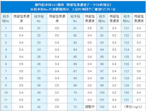 部分截取2021年7月31日,东京都131个自来水监测点余氯数据。日本规定余氯合理范围为0.1mg/L到0.4mg/L,大部分监测点符合这一标准。图片来源:东京都水道局官网