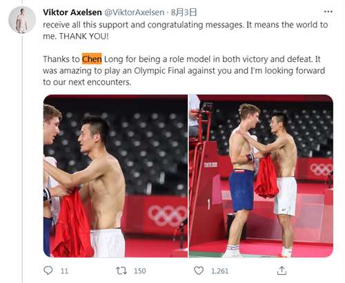 比如,丹麦羽毛球名将安赛龙在战胜中国球员谌龙后,收获个人首枚奥运金牌。比赛结束后,他用英文和中文在社交媒体对谌龙和所有球迷的感谢与支持。