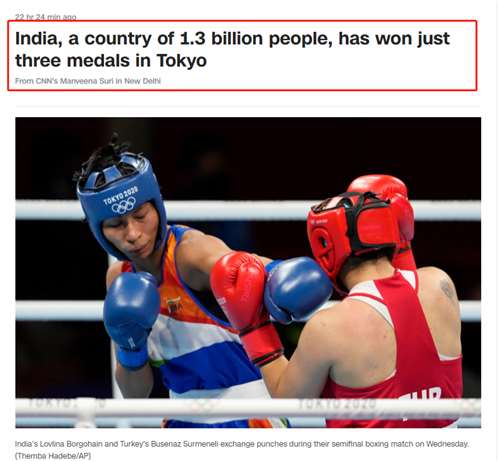 CNN4日刊发一篇文章,题目是“拥有13亿人口的印度,到现在在东京只赢了3块奖牌”。