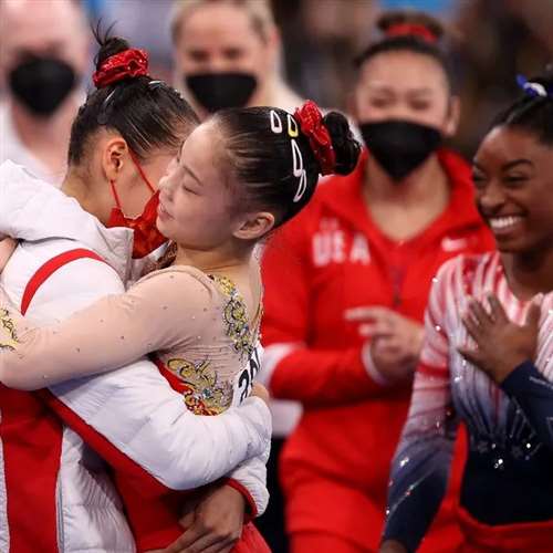 照片中,管晨辰和平衡木亚军唐茜靖激动拥抱,而站在一旁笑容灿烂、真诚祝福的则是美国体操名将拜尔斯和华裔选手苏妮莎·李。