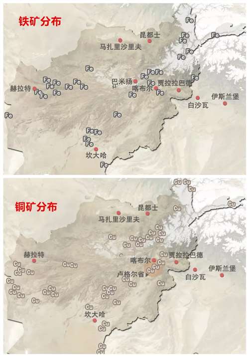 首都所在的喀布尔省延伸到卢格尔省的铜矿带,是世界上最大的铜矿带之一。该铜矿带绵延110公里,估计矿石储量达十亿吨。