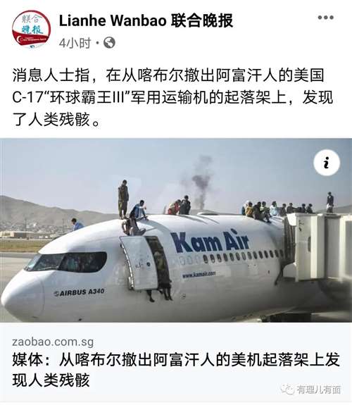 就是上面这张照片,西方文宣用其来体现包容,称连撤退也不忘带上逃难的民众。另一方面,针对美军在机场溃逃的画面,西媒则宣传为无辜民众恐惧阿塔而发生大规模逃亡。