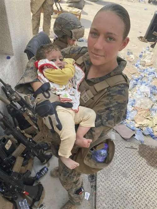 8月21日,包括美国国防部和海军陆战队在内的多个美国军方都在社交媒体上开始了“人道主义”风格的宣传,美军中央司令部公共事务组的随军记者曾拍下了多张“美军士兵怀抱婴儿”、“与阿富汗儿童亲密交流”的照片,这些照片随后被各大军方账号不断转载,下面这张照片中站立着怀抱婴儿的人,就是尼古拉斯·吉。此外这位女兵还留下了“护送阿富汗小女孩去机场”、“在飞机前持枪警戒”的宣传照,一度被美国军方当成了“宣传典型”。