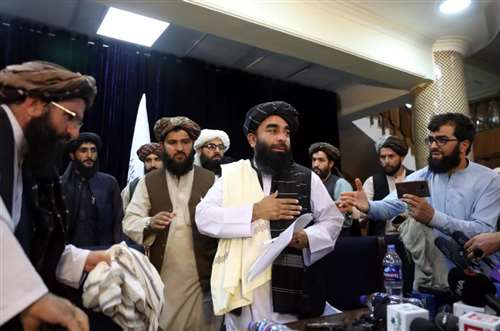 2021年8月17日,阿富汗塔利班新闻发言人扎比胡拉·穆贾希德在首都喀布尔举行记者会,阐述塔利班未来内外政策。