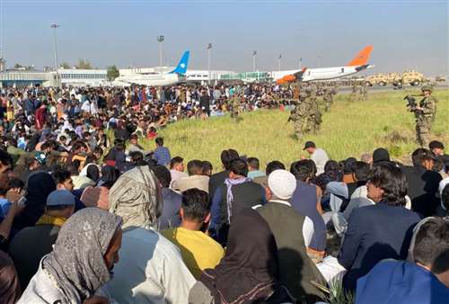 2021年8月16日,美国士兵被部署在喀布尔机场,以确保美国人及其盟友飞离阿富汗。为挤上逃离喀布尔的飞机,数千阿富汗民众涌上喀布尔机场停机坪。