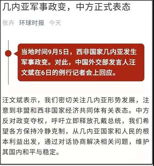 在今天下午,我们也是正式对几内亚军事政变做出回应,反对政变夺权,呼吁立即释放孔戴总统。