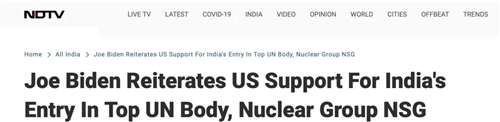 根据NDTV说法,拜登支持印度“入常”的理由是印度一直站在“推动安理会改革的前线”。此前,印度、日本、德国和巴西组成的“四国集团”曾要求联合国安理会改革并将其纳入常任理事国。