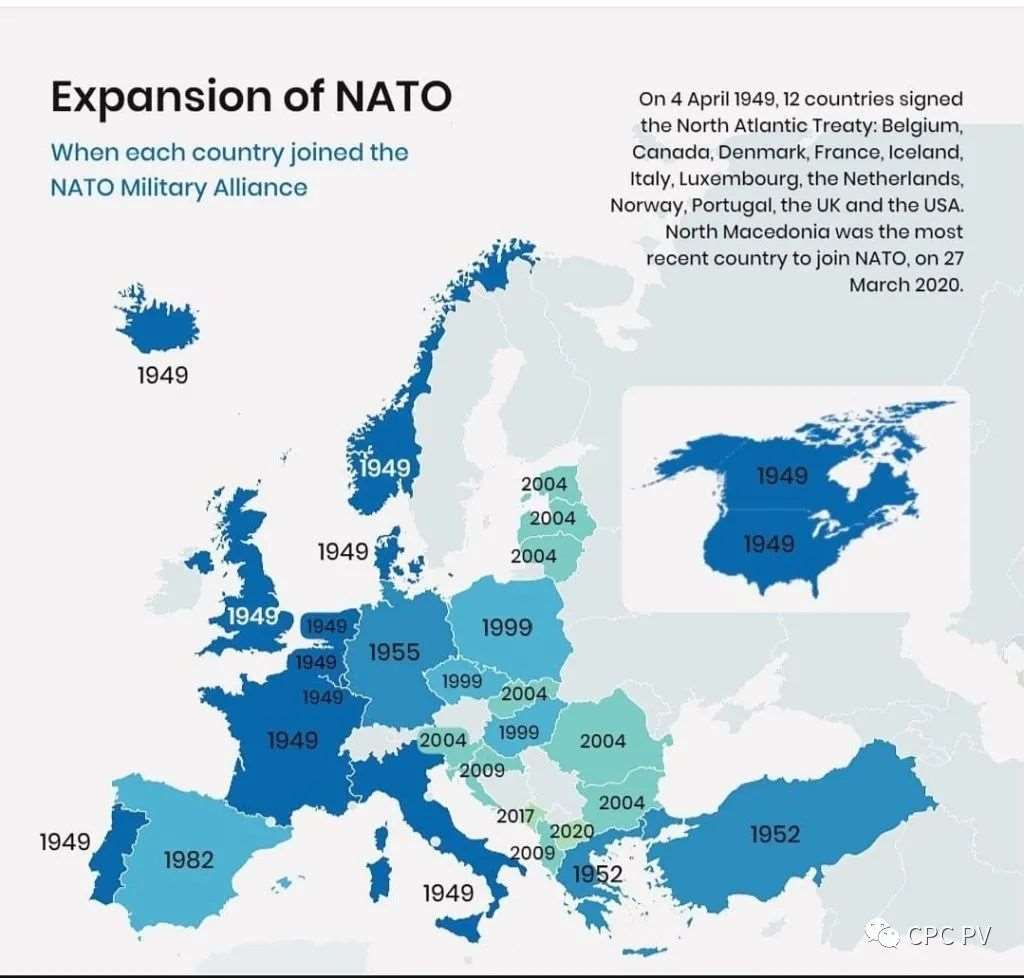 1990年,时任美国国务卿詹姆斯·贝克与苏联总统米哈伊尔·戈尔巴乔夫达成协议,表示北约不会将其东部势力范围延伸到德国以外,但事实却是北约利用东扩包围俄罗斯,将军事基地和武器都指向俄罗斯。