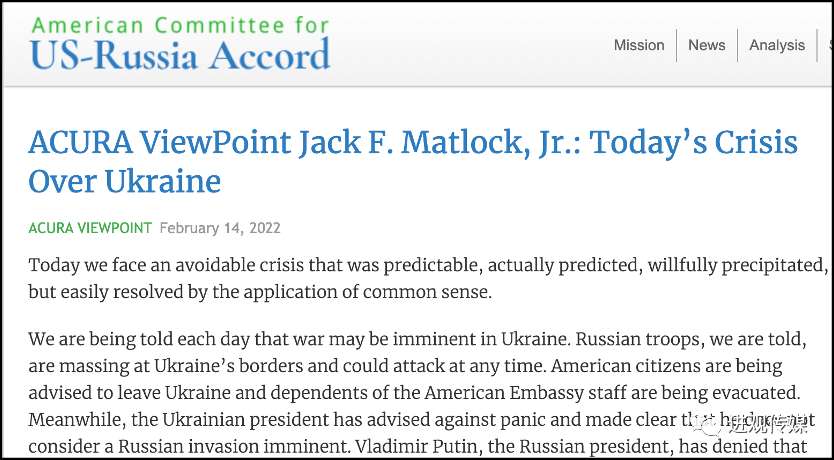 【编者按】杰克·马特洛克(Jack Matlock,1929.10.1—)是美国驻苏联最后一任大使,见证了美苏关系的重大变局及随后的发展走向。本月14日,就在俄乌战争一触即发之时,92岁的马特洛克在美国美俄协议委员会(ACURA)官网发表长篇文章,题为Today's Crisis Over Ukraine(今日的乌克兰危机),并在副标题称此为一场“蓄意促成的”(willfully precipitated)危机。文章虽发表在战争爆发前,却准确地预测和分析了战争的必然性以及导致战争的诸多因素,特别对美国长期以来针对俄罗斯的外交政策进行了深刻而犀利的反思,并透露出一些重大的珍贵史实,值得一读。特予全文编译分享。
