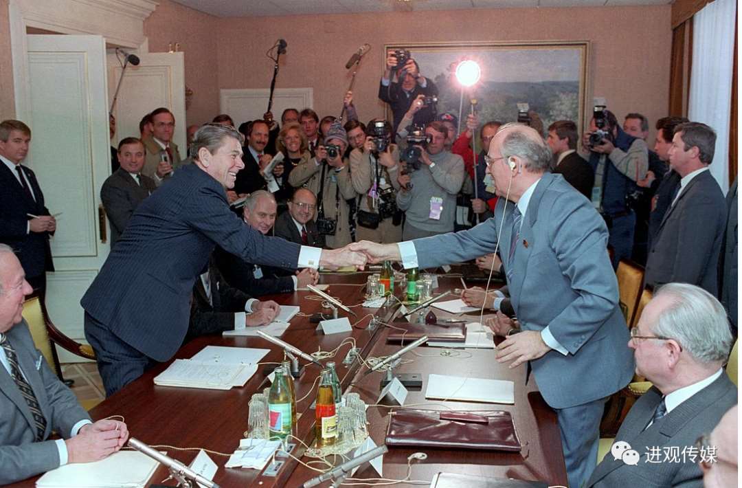 里根总统(左)与戈尔巴乔夫总书记在日内瓦峰会上握手,桌子尽头是马特洛克(网络)