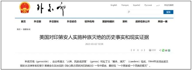 外交部网站3月2日发布《美国对印第安人实施种族灭绝的历史事实和现实证据》。