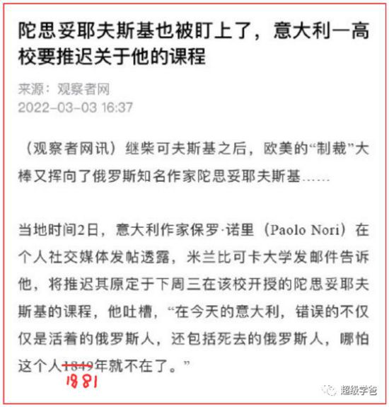 何止是病人,俄罗斯的死人也成了制裁对象。3月2日,意大利米兰比可卡大学竟然取消了俄国作家陀思妥耶夫斯基(1821~1881年)的相关课程。