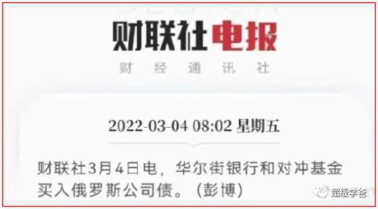 说来难以置信,当不少人唱衰俄罗斯的时候,华尔街已经下场到俄罗斯抄底去了。彭博社透露,最近几天高盛和摩根大通等机构一直在购买俄罗斯廉价的公司债券。