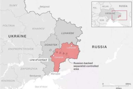 ▲“顿涅茨克人民共和国”和“卢甘斯克人民共和国”范围(红色部分)
