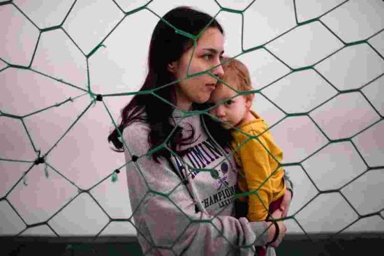 2022年3月17日,罗马尼亚敦布勒韦尼,乌克兰难民Rahela Captari抱着孩子在一个由体育场馆改造而成的乌克兰难民临时避难所内。