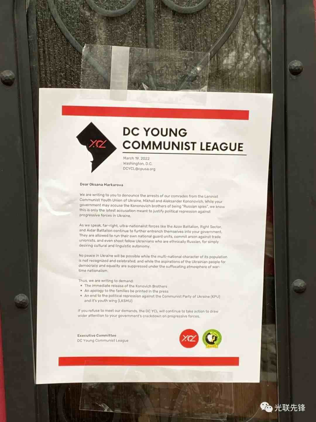 2022年3月19日,美国共产党青年翼美国共青团的华盛顿特区支部致函乌克兰大使馆,要求释放两名被捕乌克兰共产党青年领袖。美国争取社会主义与解放党华盛顿支部也参加了活动。