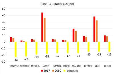 保加利亚是世界上人口减少最快的国家,预计其人口将从2017年的700万下降到2050年的540万。拉脱维亚的人口估计将从2017年的190万下降到150万,而摩尔多瓦的人口估计将从400万下降到320万。