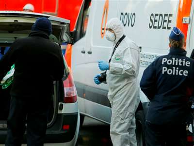 2015年11月26日,医护人员在比利时首都布鲁塞尔的大清真寺外工作。布鲁塞尔大清真寺内26日发现装有白色粉末的可疑包裹。警方疏散了大清真寺内的人员,工作人员携带检测炭疽杆菌的设备到场调查。(新华社记者周磊摄)